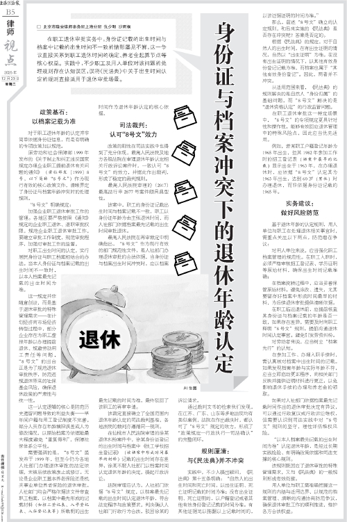 在职工退休审批实务中,身份证记载的出生时间与档案中记载的出生时间不一致的情形屡见不鲜,这一争议直接关系到职工退休时间的确定、养老金起算节点等核心权益。实践中,不少职工及用人单位对该问题的处理规则存在认知误区,误将《民法典》中关于出生时间认定的规则直接适用于退休审批场景。