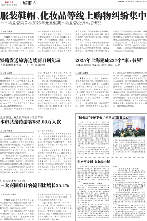 本报讯2026年首个国定假日,本市文旅市场总体运行平稳,未发生重大安全事件。记者昨天从市文旅局获悉,据上海旅游大数据监测,元旦假期本市共接待游客682.03万人次,实现全要素旅游消费总额122.71亿元。本市宾馆旅馆平均客房出租率为70%。