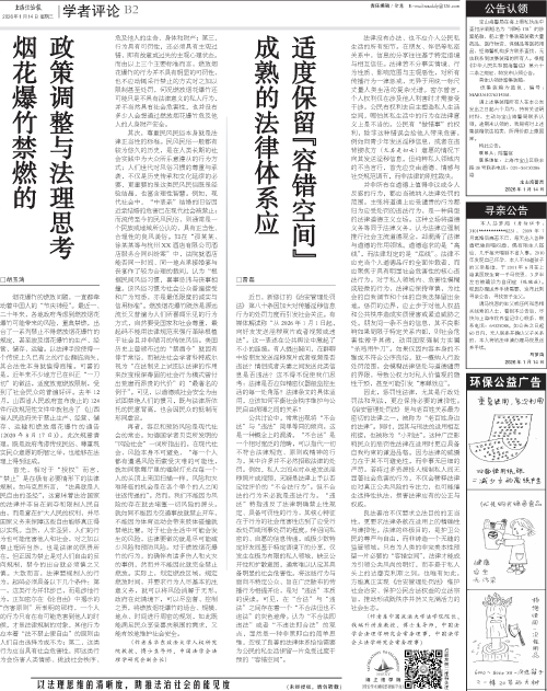 再者,容忍和预防风险是现代社会的常态。如德国学者贝克所发明的“风险社会”一词所指出的,在现代社会,风险本身不可避免,“每一个人都有遭遇风险而蒙受灾难的可能性,就如同歌舞厅里的镭射灯光在每一个人的头顶上来回扫描一样,风险和灾难降临的机会是在各个单个的人之间往返传递的”。然而,我们不能因为风险的存在就去堵塞一切风险的源头。就如同不能因为交通事故就禁止开车,不能因为体育运动会带来肢体碰撞就禁绝比赛。对于社会生活中可能会发生的风险,法律要做的就是尽可能减少风险和预防风险。对于燃放烟花爆竹的行为,的确伴有诸多伤人和火灾的事例,然而并不能因此就完全禁止燃放。实际上,划定燃放区域,规定燃放时间,并要求行为人尽基本的注意义务,就可以将风险消解于无形。政府在此情境下,可以尽监督、控制之责,将燃放烟花爆竹的场合、规模、地点、时间进行周密的规划,如此既能满足民众享受喜庆氛围的需求,又能有效地维护社会安全。