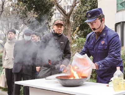 在小区广场,普陀区消防救援局设置了“消防九子游戏”“安全知识竞答”“灭真火”“水枪打靶”“破窗逃生”等群众性互动体验项目,现场开展灭火器和墙式消火栓的使用,以及防烟面罩佩戴等消防科普体验活动。公安、消防、民政、房管等结合本部门职责设置安全知识宣传服务点位,利用展板集中宣传典型居住场所火灾案例和事故教训。
