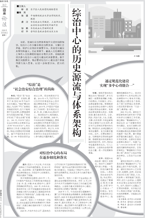 刚才侯教授也提到,2019年1月,《中国共产党政法工作条例》首次规定设立省、市、县、乡镇(街道)综治中心,赋予其明确的职责定位。2021年,中共中央、国务院印发《关于加强基层治理体系和治理能力现代化的意见》,强调坚持和发展新时代“枫桥经验”,加强乡镇(街道)综治中心规范化建设。