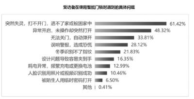 智能门锁作为居家安全的第一道防线,实际使用中,安全与便捷性双双“掉线”。61.42%的受访者遇到门锁突然失灵打不开门的情况;48.32%的受访者经历过门锁异常开启,存在安全隐患;21.83%的受访者反馈冬季指纹无法识别,影响出行。部分消费者还遇到智能门锁警报误响,通过照片或视频开锁等情况。