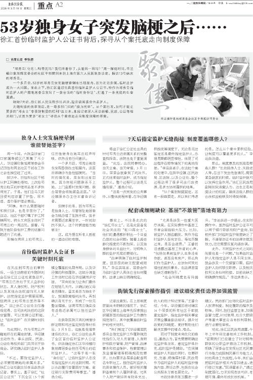 在关注到邓秀云的事件后,一场主动跨前的专题研判会在徐汇区公证处紧急召开。“邓秀云已然处于无人监护的状态,其人身权利、财产权利以及其他合法权益均无人保护,法院指定监护需要周期,但病床上的邓秀云显然等不起。”这让徐汇公证处主任潘浩觉得,在司法判决前的这段空窗期,可以发挥公证职能,让“临时监护”在关键时刻托底。