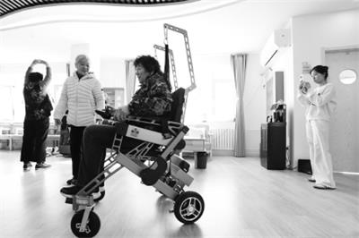 近日,北京荣华街道智慧康养机器人养老驿站启动运营,这家社区内的机器人特色养老驿站包含基础服务、机器人应用、适老化改造等三大场景。图为居民体验智能行走机器人。新华社发