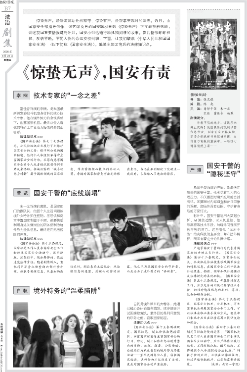 惊蛰无声,是暗流涌动处的默守;惊蛰有声,是银幕亮起时的深思。近日,由国家安全部指导创作、张艺谋执导的国安题材电影《惊蛰无声》正在春节档热映,讲述我国重要情报遭到外泄,国安小组迅速行动抓捕间谍的故事。影片情节环环相扣、反转不断,不同人物的命运交织纠缠,下面,让我们聚焦《中华人民共和国国家安全法》(以下简称《国家安全法》),解读主角团背后的法律知识点。