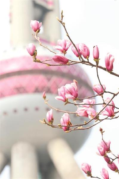 上海市花白玉兰已悄然绽放,地标建筑与市花互相衬托