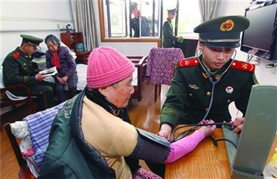 右图为武警战士在养老院为老人量血压