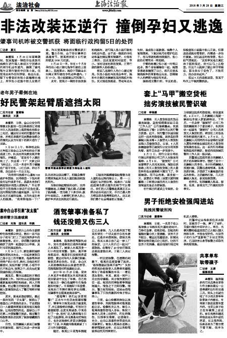 - 好民警架起臂盾遮挡太阳 □见习记者 董菁琳 通讯员 王勇 本报讯 日前,金山公安分局督察支队接到一位自称是浙江省湖州市人民政府驻上海联络处的陈女士电话,建议对分局的民警进行表扬,并将其亲眼所见民警救助群众的情况