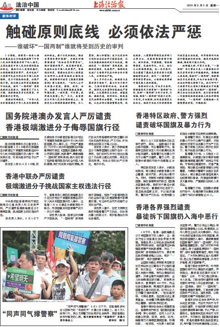 国务院港澳事务办公室发言人昨日就香港8月3日晚数名极端激进示威者扯下某建筑物前悬挂的中华人民共和国国旗并扔入海中一事发表谈话,对有关恶劣行径予以严厉谴责。