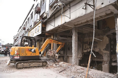 图为救援人员在发生燃气爆炸的事故现场进行清理作业 新华社 图/文