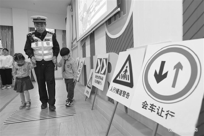 图为福州交警支队晋安大队民警在辖区幼儿园带小朋友玩“过马路”游戏