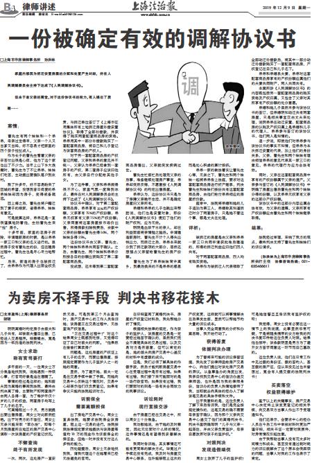 - 一份被确定有效的调解协议书 □上海市申房律师事务所 孙洪林 家庭内部因为拆迁安置房屋的分配和处置产生纠纷,并在人民调解委员会主持下达成了《人民调解协议书》。 但由于老父亲的离世,对于这份协议书的效力,有人提出了质疑……