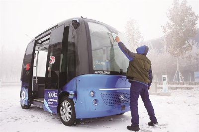 记者探访雄安新区时看到:没有传统收银台的无人超市、没有司机的无人驾驶车、刷脸入住的智慧酒店……这些“无人”元素,在摸索中打造雄安这座未来之城的智慧基因。图为工作人员在雄安新区清扫无人驾驶巴士的积雪 新华社 图/文