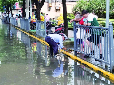 在杨浦区,杨浦公安分局中原路派出所民警立即开展道路交通疏导和险情排解工作,并对因路面杂物堵塞的下水道进行疏通。