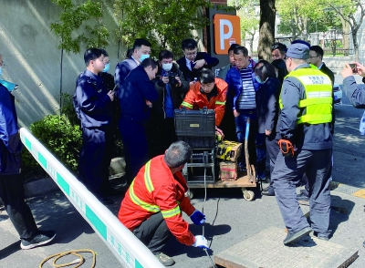 昨天,市水务局执法总队联合静安区河长办、检察院、市政、城管、生态环境等部门对静安区餐饮户开展雨污混排执法检查。图为执法人员检测原平路灵石路路口的餐饮户雨水井水质