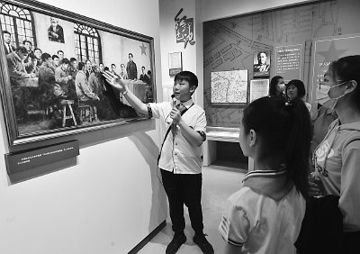 图为俞浩然同学担任红色讲解员,在向观众讲解红色故事