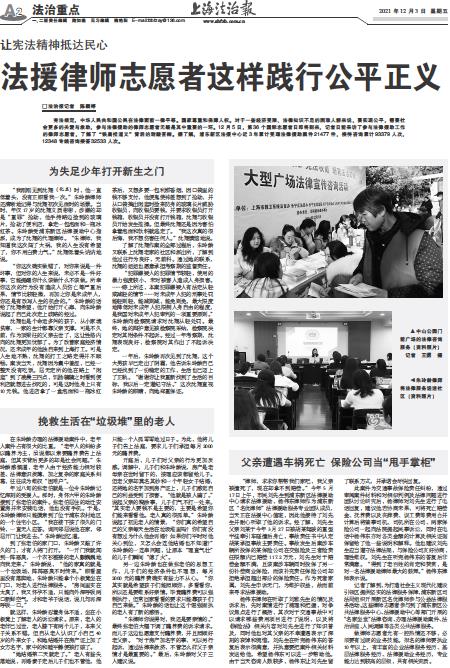 宪法规定,中华人民共和国公民在法律面前一律平等。国家尊重和保障人权。对于一些经济受限、法律知识不足的困难人群来说,要实现公平,需要社会更多的关爱与救助,参与法律援助的律师志愿者无疑是其中重要的一环。12月5日,第36个国际志愿者日即将到来,记者日前采访了参与法律援助工作的律师志愿者,了解了“铁肩担道义”背后的甜酸苦辣。据了解,浦东新区法援中心近3年累计受理法律援助案件21477件,接待咨询累计93379人次,12348专线咨询接答32533人次。