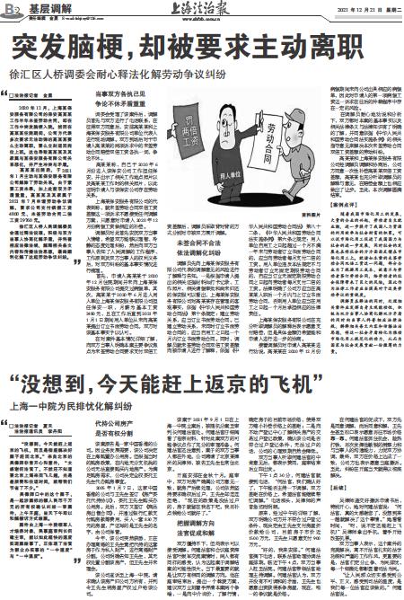 2020年12月,上海某保安服务有限公司的保安高某某工作半年未签劳动合同,却在工作中突发脑梗入院。然而在高某某住院期间,公司方代表多次要求无法动弹的高某某要么主动离职,要么立刻返回岗位上班。这也导致高某某及其家属与某保安服务有限公司关系恶化,并产生冲突与矛盾。