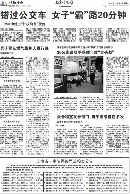 12月13日,普陀公安分局长寿路派出所接到报警称,长寿路与叶家宅路路口有一中年女子因未赶上公交车,拦在公交车前近20分钟不愿离开。接报后,民警立即赶赴现场处置,将拦在公交车前的女子史某传唤至派出所作进一步调查。