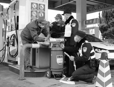 本报讯 连日来,嘉定公安分局在持续开展“砺剑1号”行动中结合“动态隐患清零”工作,对辖区易存在治安、消防、交通等隐患的重点部位、区域会同社会各部门全力以赴做好城市安全隐患全覆盖清查整治,以确保岁末年初社会面安全稳定。图为12月28日,娄塘派出所民警在加油站与安全员进行治安、消防检查