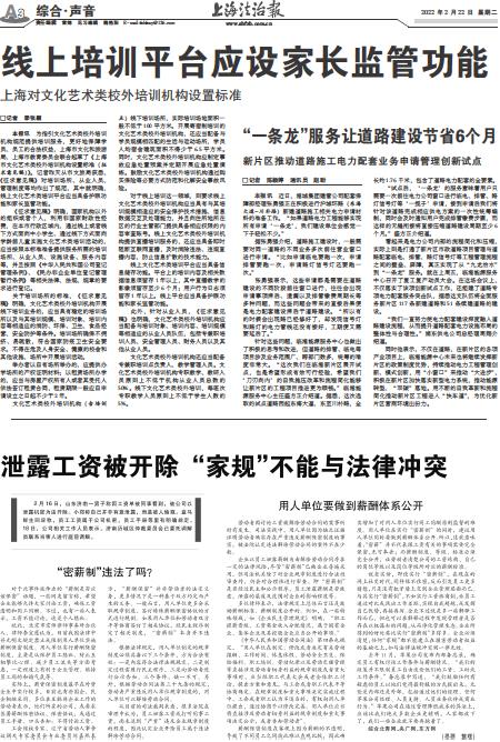 - 线上培训平台应设家长监管功能 □记者 季张颖 本报讯 为指引文化艺术类校外培训机构规范提供培训服务,更好地保障学员、员工的合法权益,上海市文化和旅游局、上海市教育委员会联合起草了《上海市文化艺术类校外培训机构设置标准(征求意
