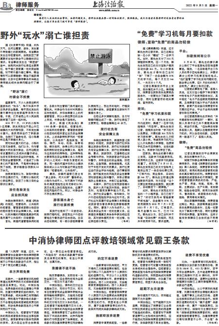 - 野外“玩水”溺亡谁担责 编者按: 每有引人关注的社会事件、法律问题发生,律师往往能在第一时间给出提示、提供服务。我们为读者采集律师对这些身边事的法律解析,让您不用出家门就可享受“律师服务”。 据《北京青年报》报道,炎热天