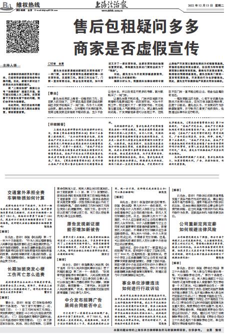 - 售后包租疑问多多商家是否虚假宣传 主持人语 本报维权热线栏目自开通以来,已经有很多读者咨询各种法律问题。在此,感谢大家对这个栏目的关注和踊跃提问。 现“上海法治报”微信公众号“法律服务”通道已开通,您可通过扫描上方二维码,在页面最