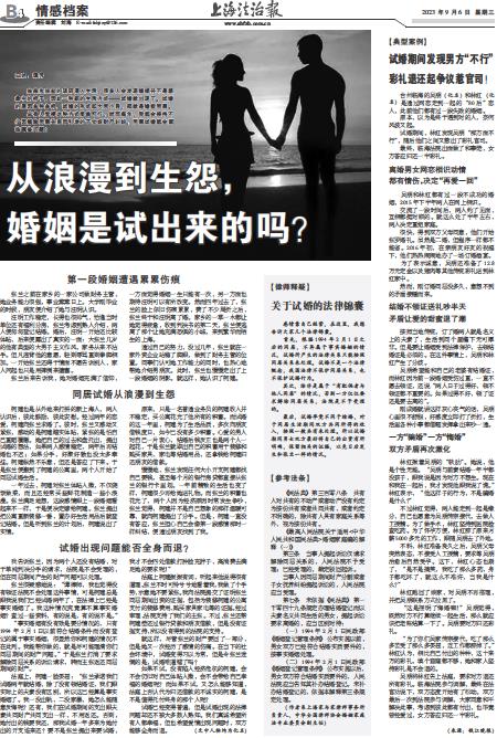 试婚已经变得普遍,但是试婚出现的法律问题却还不被大多数人熟知。我们真诚希望所有人都幸福,但也希望爱情出现问题时,双方能够全身而退。 (文中人物均为化名)