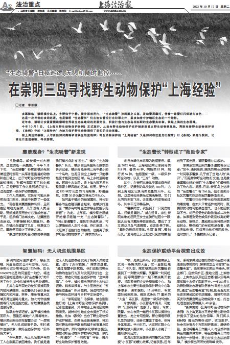“新实施的《上海市野生动物保护条例》为上海更高水平推进野生动物保护提供了坚实的法治保障,我们将从《条例》提出的野保巡护、收容救护、社会共治等各个方面剖析提炼、凝结经验,主动将警务工作融入人与自然和谐共生的整体谋划中,将生态警务工作的触角进一步延伸,努力夯实生态法治屏障。”横沙派出所所长杨珠峰表示。