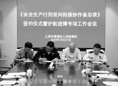 本报讯 近日,青浦区人民检察院联合该区公安分局、区应急管理局、区消防支队召开护航进博专项会议。会上,四家单位就《安全生产行刑双向衔接协作备忘录》(下简称“备忘录”)举行了签约仪式,并对安全生产领域护航进博专项工作情况进行了交流座谈。
