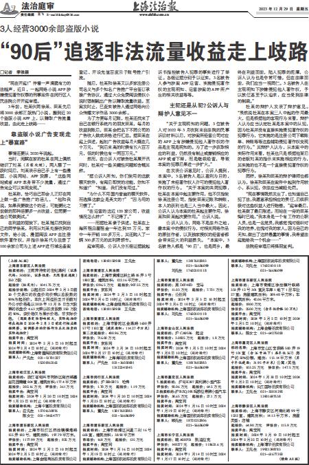 - “90后”追逐非法流量收益走上歧路 □记者 季张颖 “现在开庭!”伴着一声清脆有力的法槌声,近日,一起网络小说APP涉嫌侵犯著作权罪的刑事案件在闵行区人民法院公开开庭审理。 3年前,杜某伙同徐某、田某先后将3000余部正版热门小说