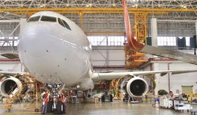 图为10月21日,在海南自贸港一站式飞机维修产业基地内,海航航空技术有限公司的机务维修人员对进境飞机进行检修。