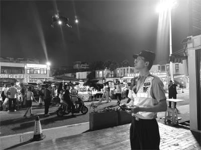 本报讯 夏季以来,位于宝山区顾村镇的智慧湾园区人头攒动,几十辆私家车整齐排列,这片独特的“后备箱集市”组成城市夜经济的一部分。入夏以来,宝山公安分局顾村派出所因地施策,通过优化勤务、地空联动等举措护航夜市烟火气。顾村派出所通过无人机定点升空,全域扫描园内人流聚集点、交通拥堵点,一旦发现异常,附近警力精准切入,确保“微小隐患不出圈”。