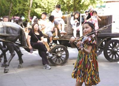 图为8月4日,在新疆伊犁哈萨克自治州伊宁市六星街,一名维吾尔族小女孩正在为游客演奏 新华社图/文