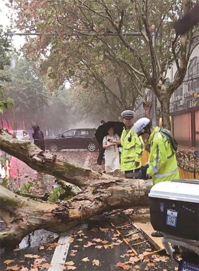 记者现场看到,倒伏树木横档在马路中央,往来车辆通行受阻,所幸事故并未造成人员伤亡、车辆受损,民警正在暴雨中尝试锯断树桩恢复道路通行,并指挥往来车辆掉头绕行。