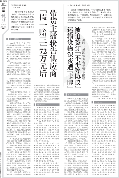- “假一赔三”72万元后带货主播状告供应商 □ 通讯员 岑祺 张逸帆 记者 徐荔 知名主播带的货竟是“假货”,供应商怠于赔偿,主播所属经纪公司向消费者“假一赔三”后,是否有权向供应商追偿?责任应当如何划分? 近日,