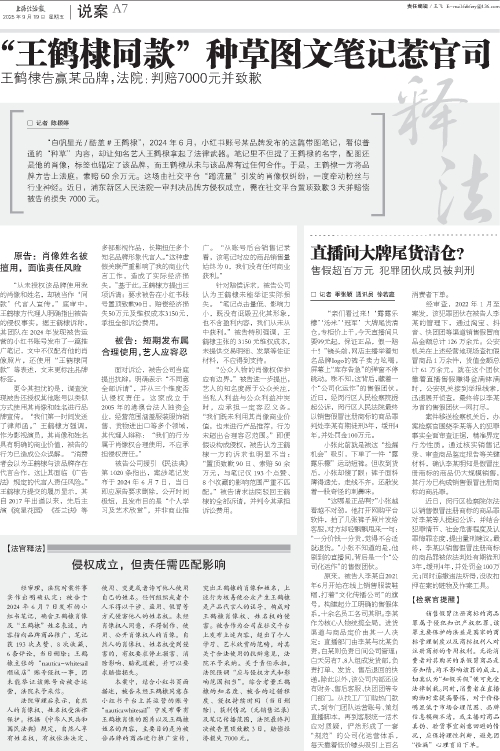 本案中,结合小红书页面描述,被告未经王鹤棣同意在小红书平台上其运营的账号“nauticawhitesail”中发布带有王鹤棣肖像的图片以及王鹤棣姓名的内容,主要目的是为被告品牌的商品进行推广宣传,突出王鹤棣的肖像和姓名,上述行为极易使公众产生王鹤棣是产品代言人的误导,构成对王鹤棣肖像权、姓名权的侵害。被告作为公司在社交平台上发布上述内容,超出了个人学习、艺术欣赏的范畴,对其关于合法使用的抗辩意见,法院不予采纳。关于责任承担,法院强调“应与侵权方式和影响范围相当”。综合考量王鹤棣的知名度、被告的过错程度、侵权持续时间(当日删除)、获利情况(无销售记录)及笔记传播范围,法院最终判决被告置顶致歉3日,赔偿经济损失7000元。