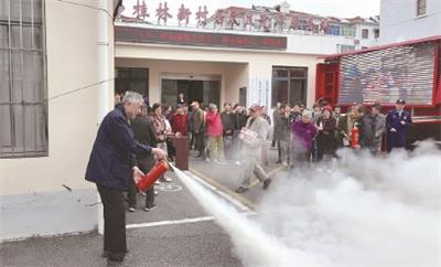 崇明消防队员在社区手把手指导村居民实操体验,演示“提、拔、握、压”灭火器使用口诀,
